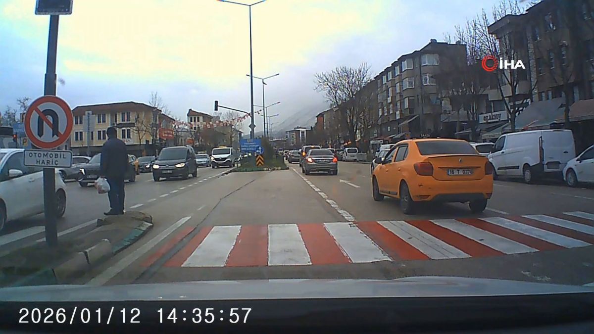 Bu sırada 16 BJP plakalı otomobil, sola dönüş yapacakmış gibi dönüş şeridine girdi. Ancak sola dönüşten vazgeçen sürücü şerit değiştirip yoluna devam etmek istedi. Manevra sırasında geçitteki yayanın canını hiçe sayan sürücü tehlike yaşattı. Muhtemel bir kazanın son anda önlendiği olay, trafik kurallarının ihlal edilmesinin doğurabileceği ciddi sonuçları bir kez daha gözler önüne serdi. O anlar da bir otomobilin araç kamerasına yansıdı.