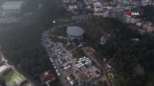Yaklaşık 1 kilometreyi bulan kuyrukta teleferiğe binmek için bekleyenler, dron ile havadan da görüntülendi.