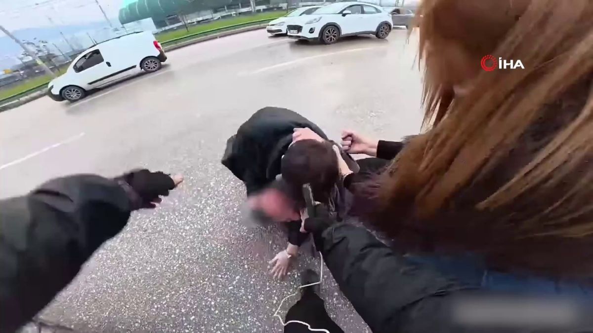 Bursa'da iki sürücü arasında 'yol verme' tartışması nedeniyle çıkan kavgada tarafların birbirine uçan tekmeyle saldırdığı anlar kameraya yansırken, kavgayı yoldan geçen kurye ayırdı.
