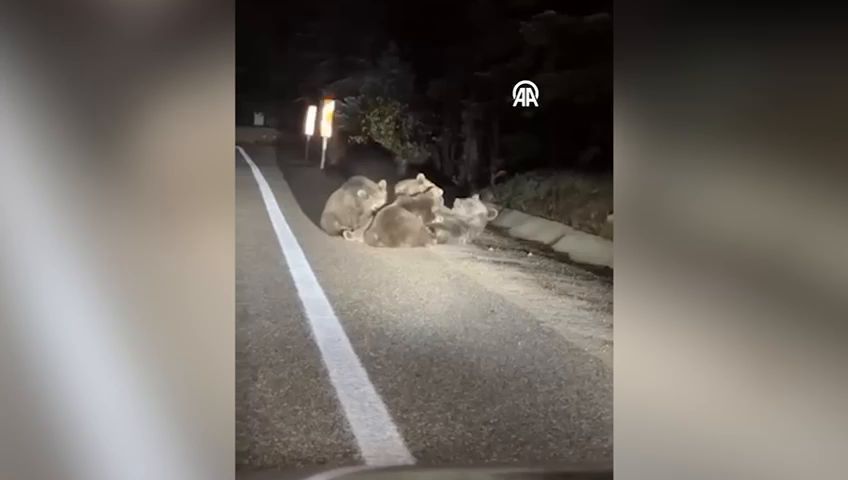 Bursa'da, Uludağ yolunda bir ayının yavrularını emzirmesi cep telefonu kamerasıyla kaydedildi.